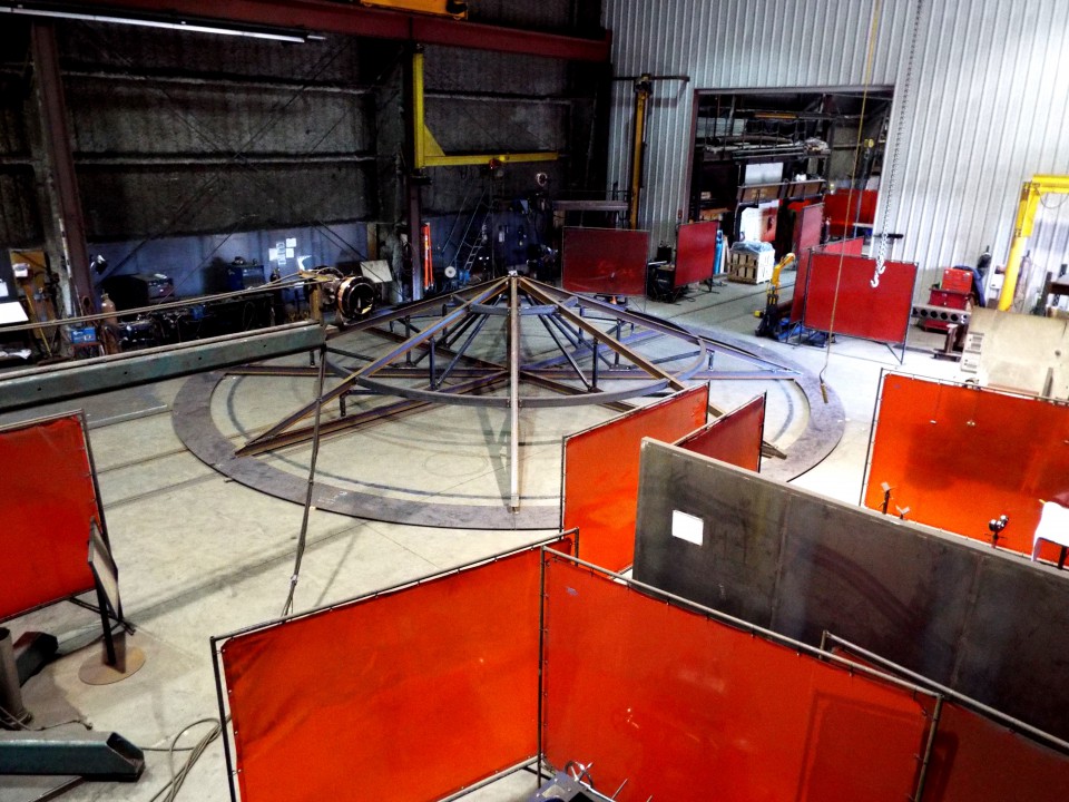 We produce some beautiful custom fabrications in our shop and this assemblable 40’ diameter carbon steel roof jig is a great example. The roof jig was designed to serve as a supportive skeleton and guide for the field construction of a large tank’s roof. When in use, the jig will have roof materials securely placed on top of it while each section of the roof is welded together. Once the roof has fully taken shape, holes and ports will be cut and flanges attached to accommodate piping, instruments and other attachments. The most elegant part of this fabrication was that it was designed to be disassembled for transport and easily reassembled in field. Upon receipt, our client was quite satisfied with this fine looking fabricated jig.